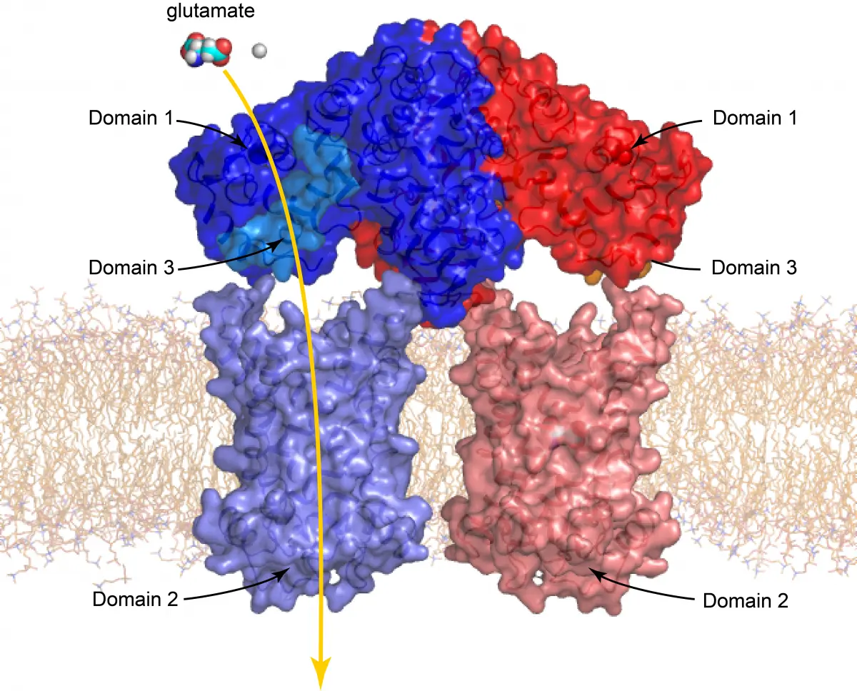 Citrin consists of three domains. Domain 1 is the calcium regulatory domain, domain 2 the carrier domain and domain 3, an amphipathic helix, which is bound to the regulatory domain in the calcium-bound state. Two citrin proteins, one coloured blue and the other red, form together a dimer. Also shown is a glutamate molecule, which is transported by the carrier domain through the inner membrane together with a proton.