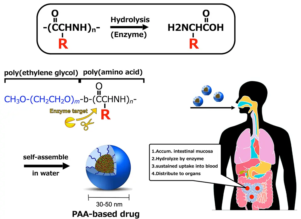In order to solve these problems, we have started a novel amino acids delivery system by molecular assembling of poly(amino acid) nanoparticles (NanoAA). After the administration of NanoAA, it is metabolized slowly to generate the corresponding amino acid and supply sustainedly to the body. This system improved amino acid therapy. We have confirmed so far Nanoarginine, Nanoorthinine and NanoL-DOPA for cancer, acute liver failure, and Parkinson’s disease therapies, respectively. Here, we would like to propose a new target, citrin deficiency therapy by our new NanoAA.