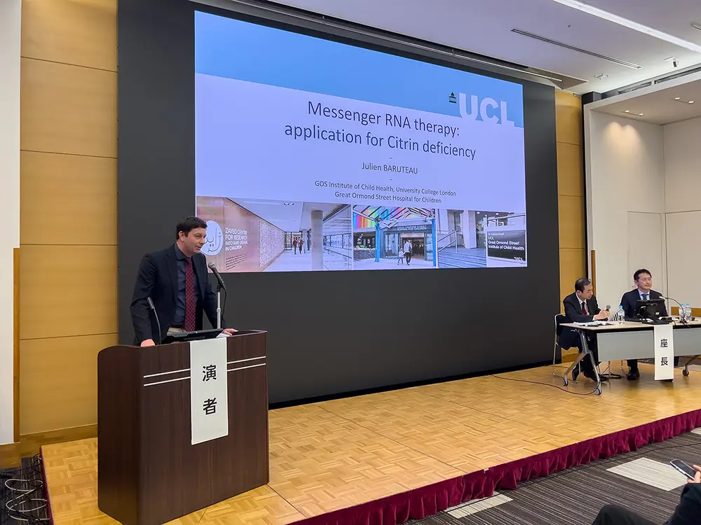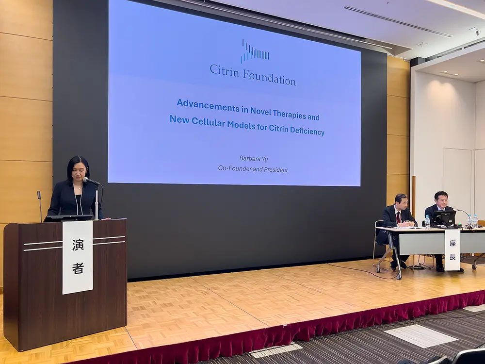 学会のハイライトは、11月8日に財団が主催したシトリン欠損症シンポジウムでした。このシンポジウムでは、シトリン欠損症に対する新しい治療法と細胞モデルにおける最新の研究に焦点が当てられました。中村公俊先生大石公彦先生による司会のもと、このセッションには多数の参加者が集まりました。財団の共同創設者であり代表であるバーバラ・ユーによる概要説明に続き、シトリン欠損症の分野で財団が支援するプロジェクトを主導するジョセフ・バウアー先生ジュリアン・バルトー先生城戸淳先生による講演が行われました。